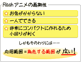 もしも、自分が作りたいものがはっきりしているなら、Flashという選択肢が一番ですよ。ソフトをダウンロード購入すれば、今日からでも作り始めることができるし、作品をどこかに送ったりする必要さえない。ネットにアップすれば、センス次第ですぐに声がかかるはずです。あるいは、映像を作りたいけど、どうも人付き合いが上手くない、という人にとっても、Flashは強力な武器になるハズです。これまではアニメ作家になろうと思ったら、アート系を別にすれば、スタジオの社員、スタッフとして、何年も地道に修行するしかなかったわけですからね。